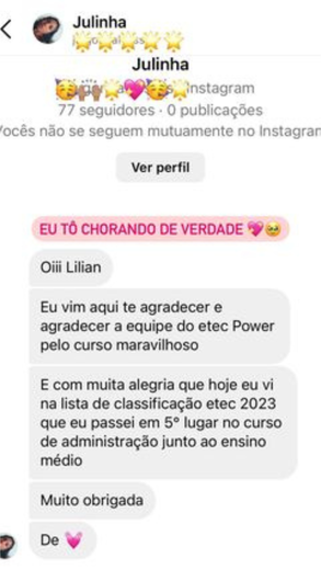 Depois de ser aprovada em 4º lugar na ETEC e mais de de 10 vezes em vestibulares (incluindo o ENEM e alguns bem conhecidos, como UNIFESP e UNESP), me dediquei a ajudar as pessoas que querem passar na ETEC, compartilhando o meu método de estudo, o mesmo que já levou milhares de alunos do zero absoluto até a aprovação.